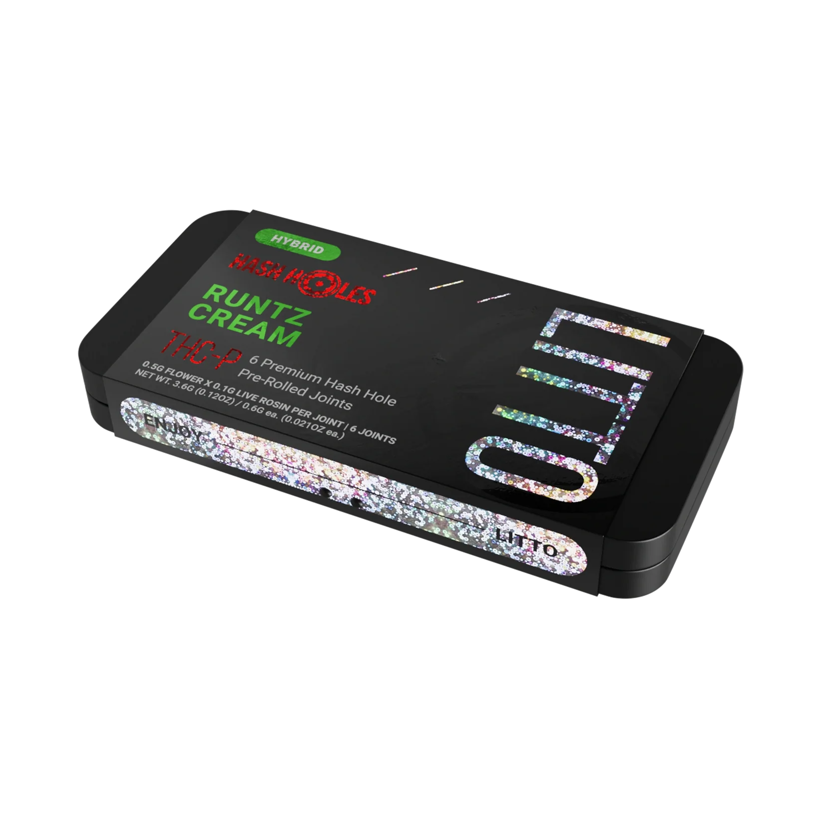 Litto THC-P Premium Hash Holes Pre-Rolls, offering 3.6 grams of THC-P flower and Live Rosin loaded in 6 pre-rolls, each measuring 0.6 grams.